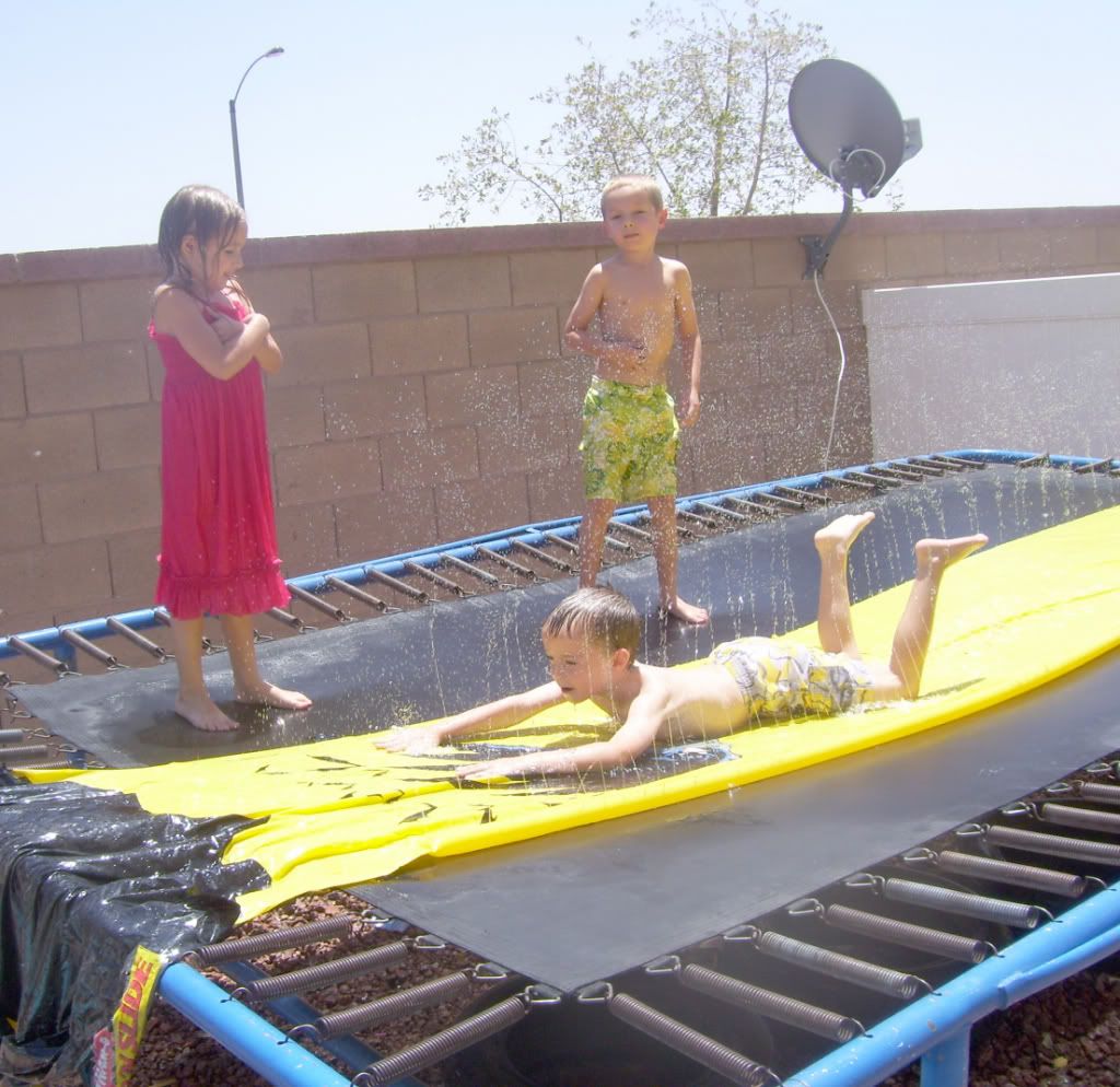 The husband and kids came home around lunch time. Aaron headed out to play tennis in this gorgeous weather and the kids instead of showering off their campfire smell, decided to spray it off with the slip and slide on the trampoline.